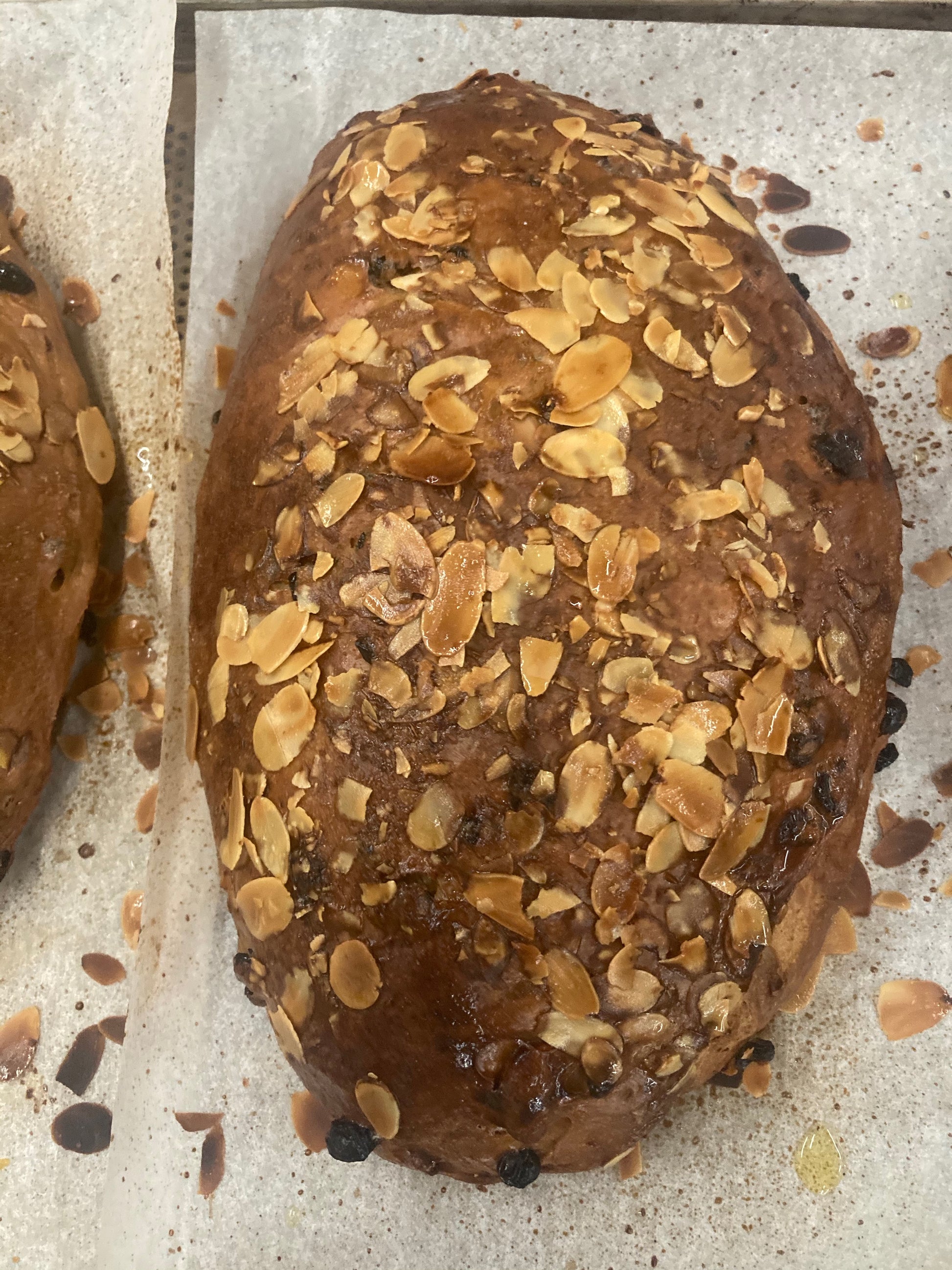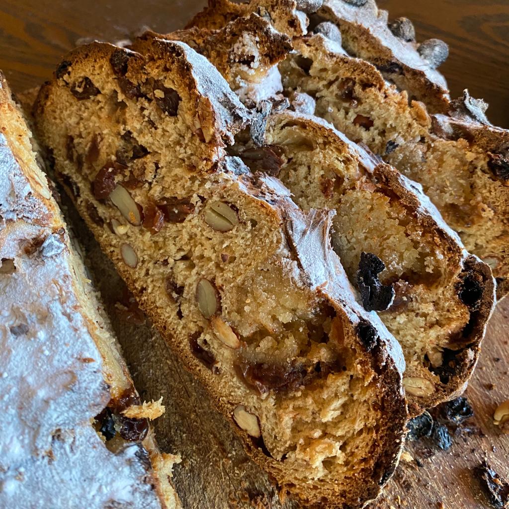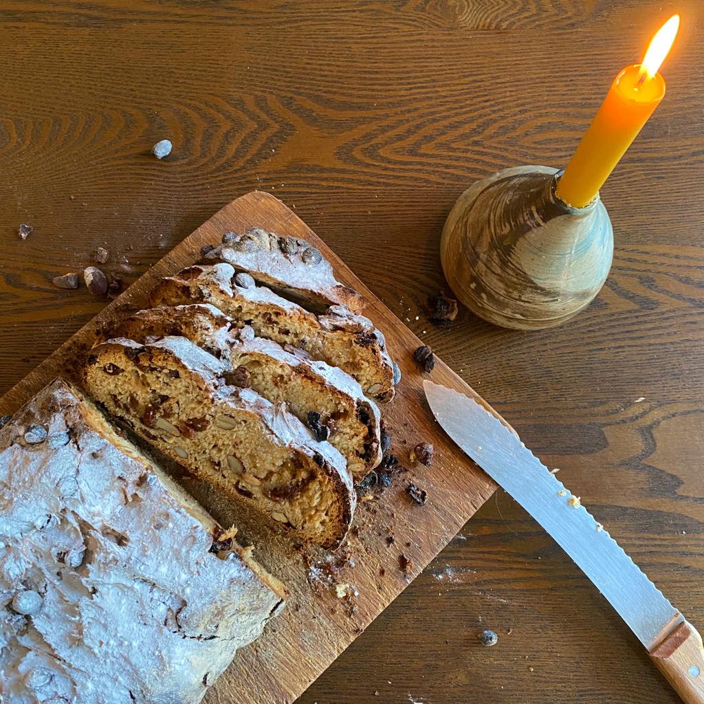 Onze stol is gemaakt van lokale steengemalen granen. Amandelen, rozijnen, krenten & citroenschil gedrenkt in onze huisgemaakte mout, donkere rum en kaneel. Natuurlijk met echt amandelspijs. De stol weegt zo'n 750 gram.